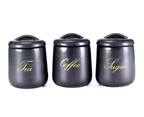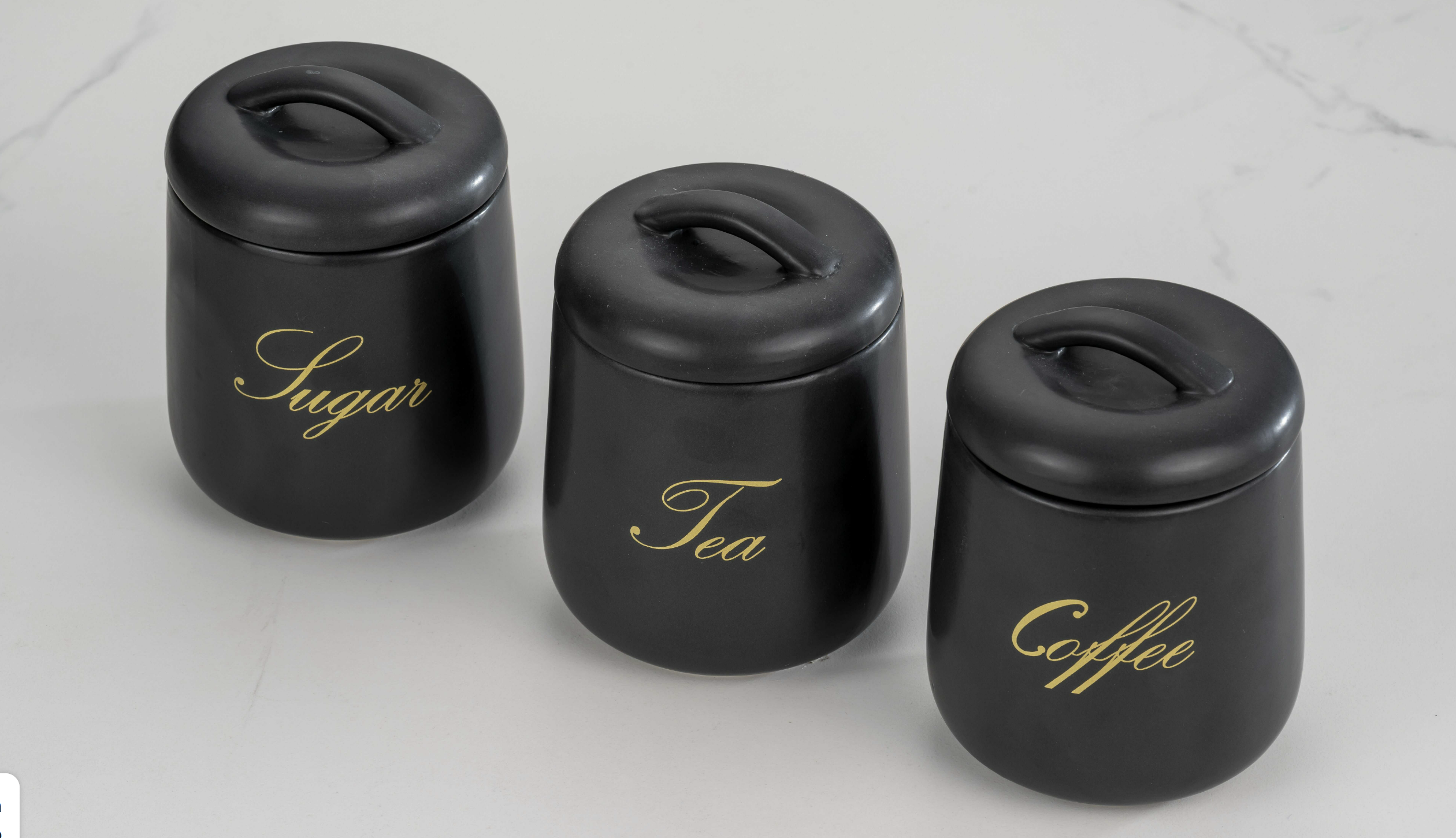 סט אחסון 3 חלקים לקפה תה סוכר GRANITE בעיצוב רטרו בצבע שחור מאט עם כיתוב זהב