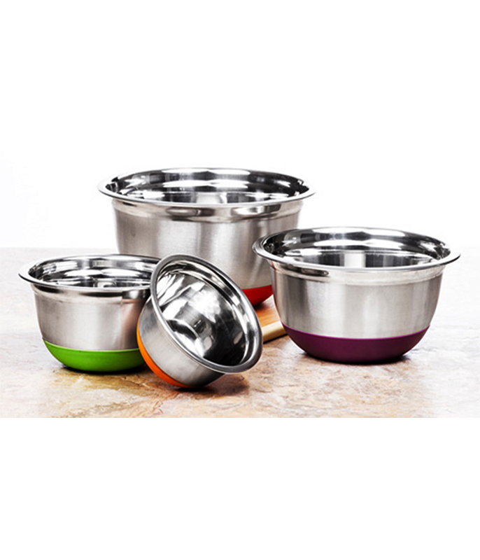 קערת ערבוב מנירוסטה עם בסיס סיליקון שטוח ושוליים רחבים לאחיזה, יציבות ונוחות העבודה.