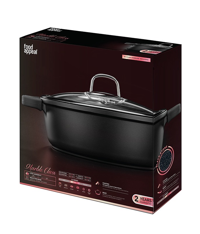 סדרת MARBLE CLASS פרי פיתוחה של חברת food appeal מביאה לכם את הדור הבא של הבישול הטביעי באבן שיש עם עיצוב מרהיב וטכנולוגיה חדשנית אשר הופכים את תהליך הבישול לחוויה! כלי הבישול מסדרת MARBLE CLASS מיוצרים בטכנוגיה חדשה של יציקת אלומיניום המאחדת את גוף הכלי והמשטח החיצוני ליחידה אחת חזקה ועמידה ביותר. הכלים מיוצרים בעובי משתנה, בסיס עבה ושוליים צרים, לנוחות השימוש ואפקטיביות חום מרבית. משטח פנימי מאבן שיש MARBLE CLASS הינו משטח בעל תכונות נון-סטיק מעולות. אינו מכיל כימיקלים רעילים ומהווה חלק מיציקת הסיר.