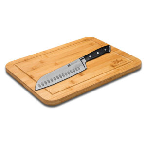 סט קרש חיתוך במבוק + סכין סנטוקו מקצועית 18 ס"מ CULT